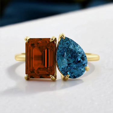 A striking partnership of fire and ice. This highly fashionable Toi et Moi ring makes a bold statement by pairing two dramatically contrasting stones: a vivid Emerald-cut Deep Red Gemstone and a brilliant Pear-cut Blue Gemstone. The two distinct shapes and colors meet seamlessly on a sleek, high-polish band.