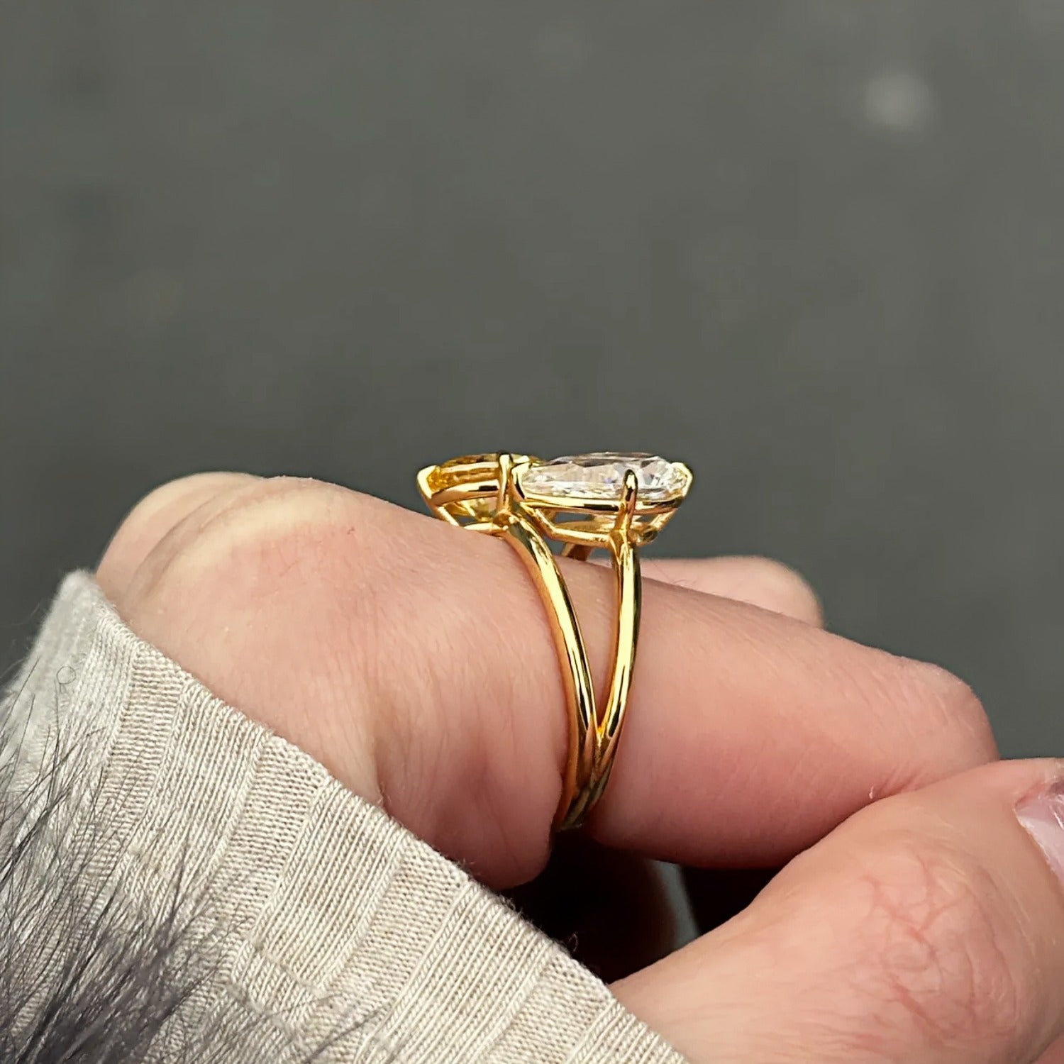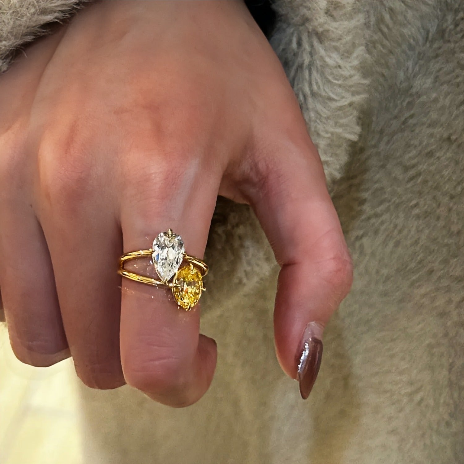 Define your love with modern elegance and vibrant style. This stunning 'Toi et Moi' (You and Me) ring is a truly fashionable statement, combining a clear, sophisticated Pear-cut stone with a radiant Oval-cut Yellow stone, beautifully symbolizing the duality and harmony of a relationship. Set in a sleek, minimalist Double-Band of Gold-plated Sterling Silver (S925), the clean lines and dynamic pairing make it highly distinctive. Its contemporary design is perfect for adding a touch of everyday chic to any outfit, yet its deeply romantic meaning and unique visual impact make it an unforgettable alternative engagement ring or a treasured anniversary gift.