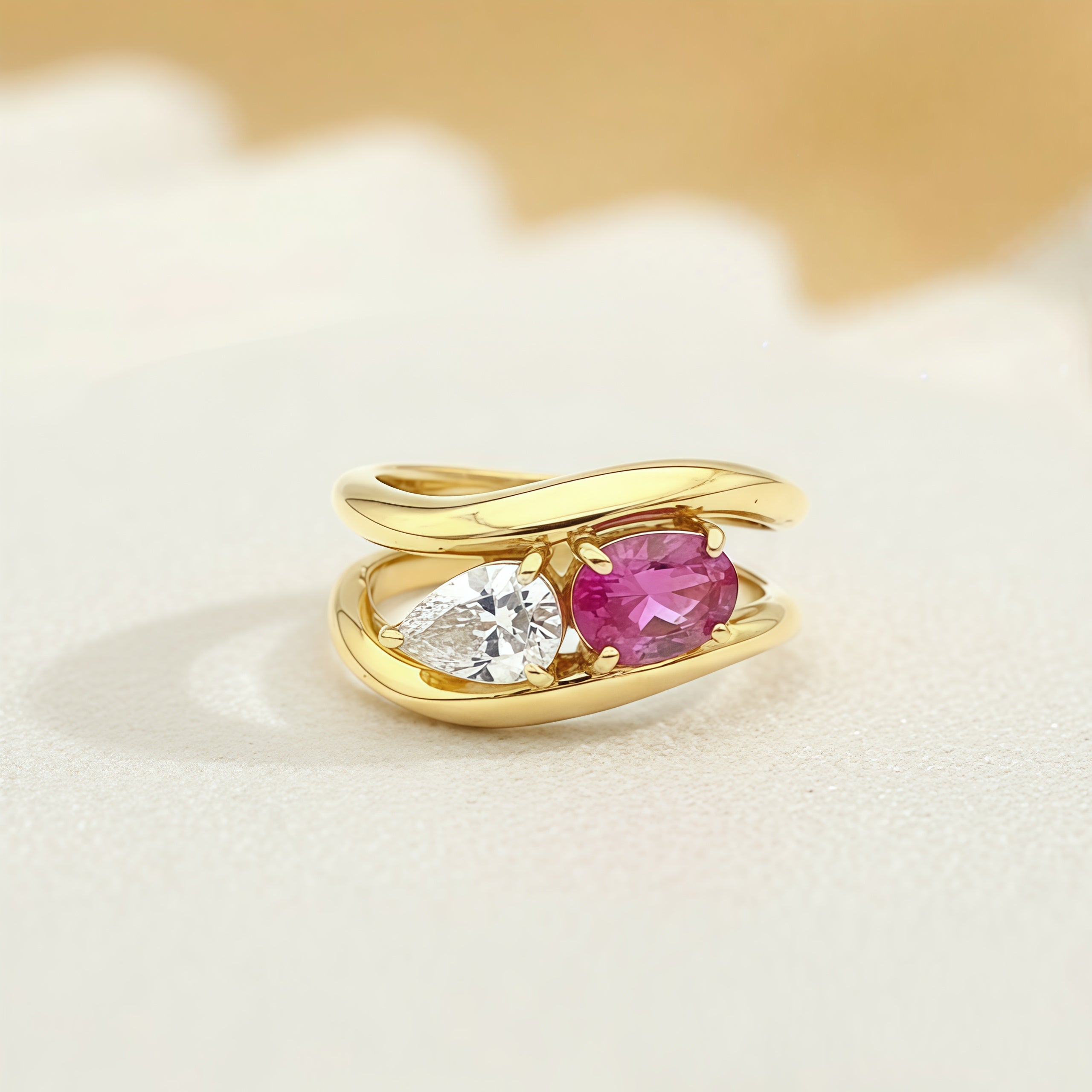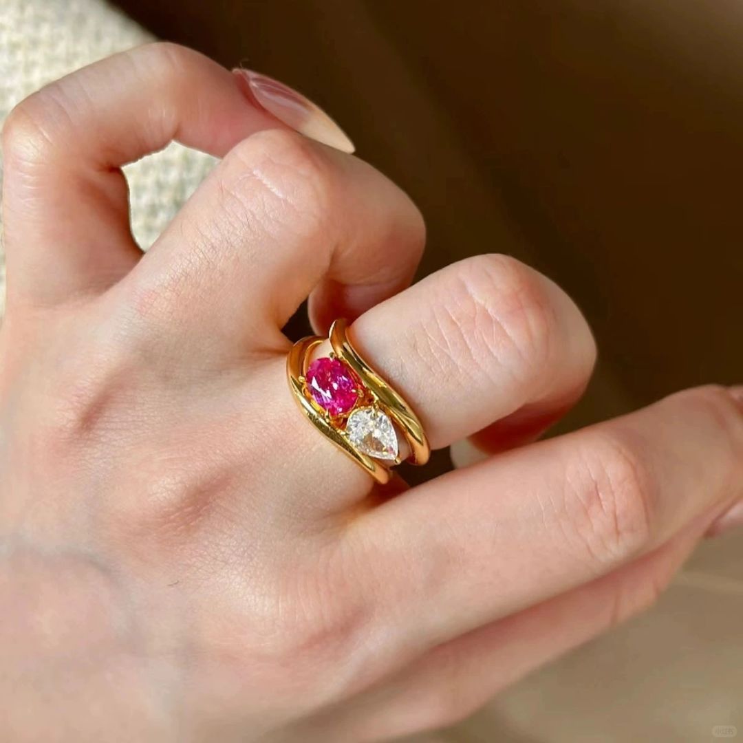 Sculptural beauty meets vibrant color. This stunning 'Toi et Moi' (You and Me) ring is a work of art, featuring a brilliant Pear-cut white gemstone and a vivid Oval-cut pink/red gemstone perfectly set within a high-polished, flowing band. The Wavy Bypass design of the gold-plated setting captures movement and represents the intertwining of two paths. Crafted from Genuine Sterling Silver (S925) and richly plated with Gold, this piece is a sophisticated, statement-making tribute to modern romance and design.