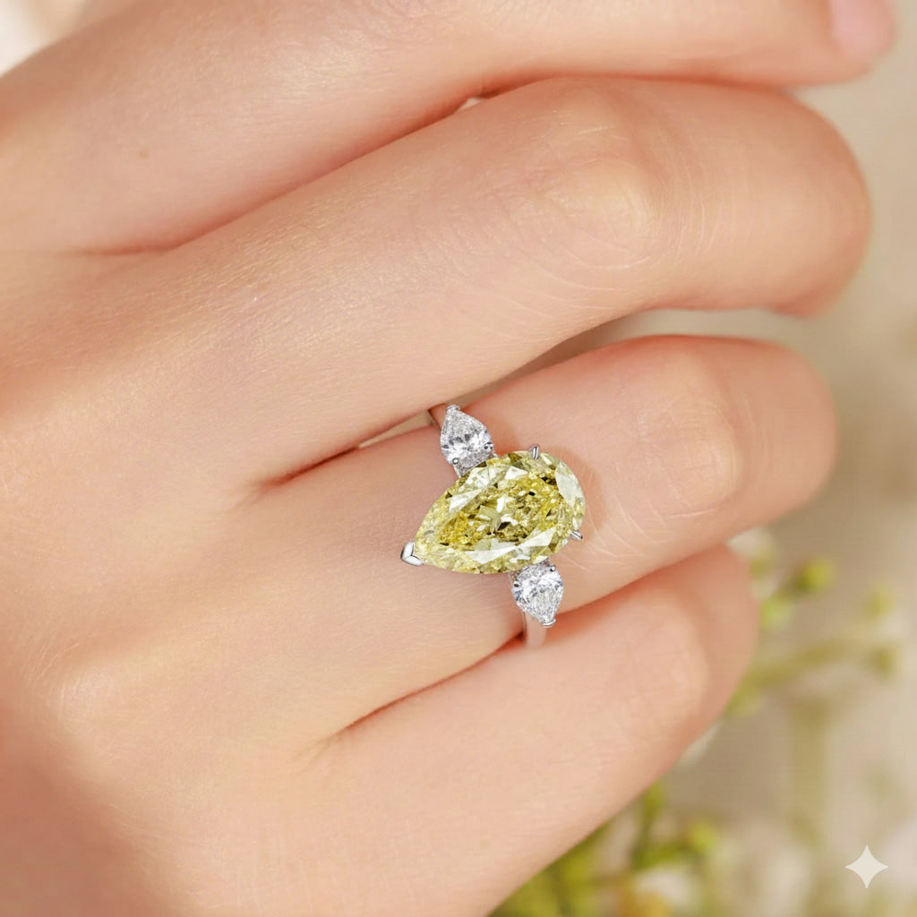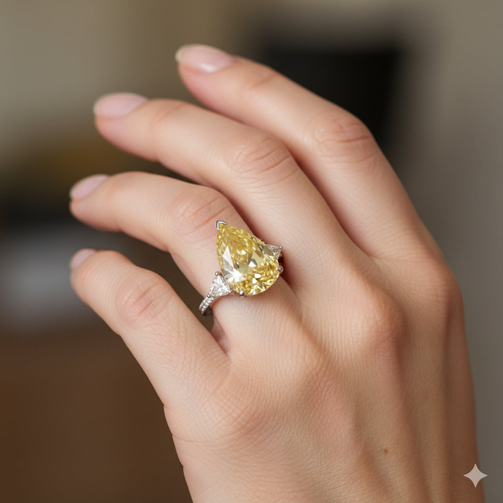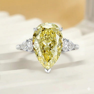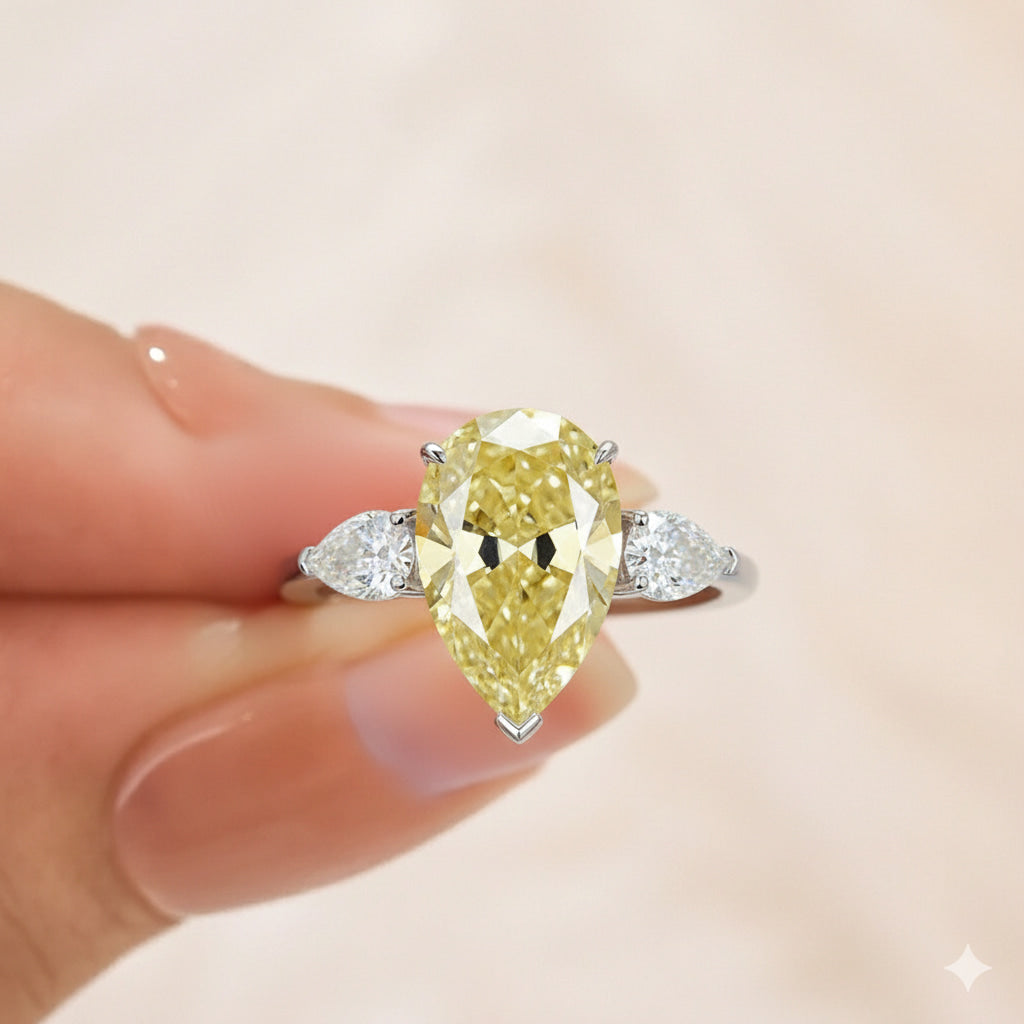 Vibrant style meets bold, romantic elegance. This strikingly fashionable three-stone ring centers on a magnificent, large Pear-cut Yellow gemstone, radiating joy and optimism. The unique centerpiece is beautifully complemented by two brilliant white accent stones on either side, creating a flattering and powerful silhouette.