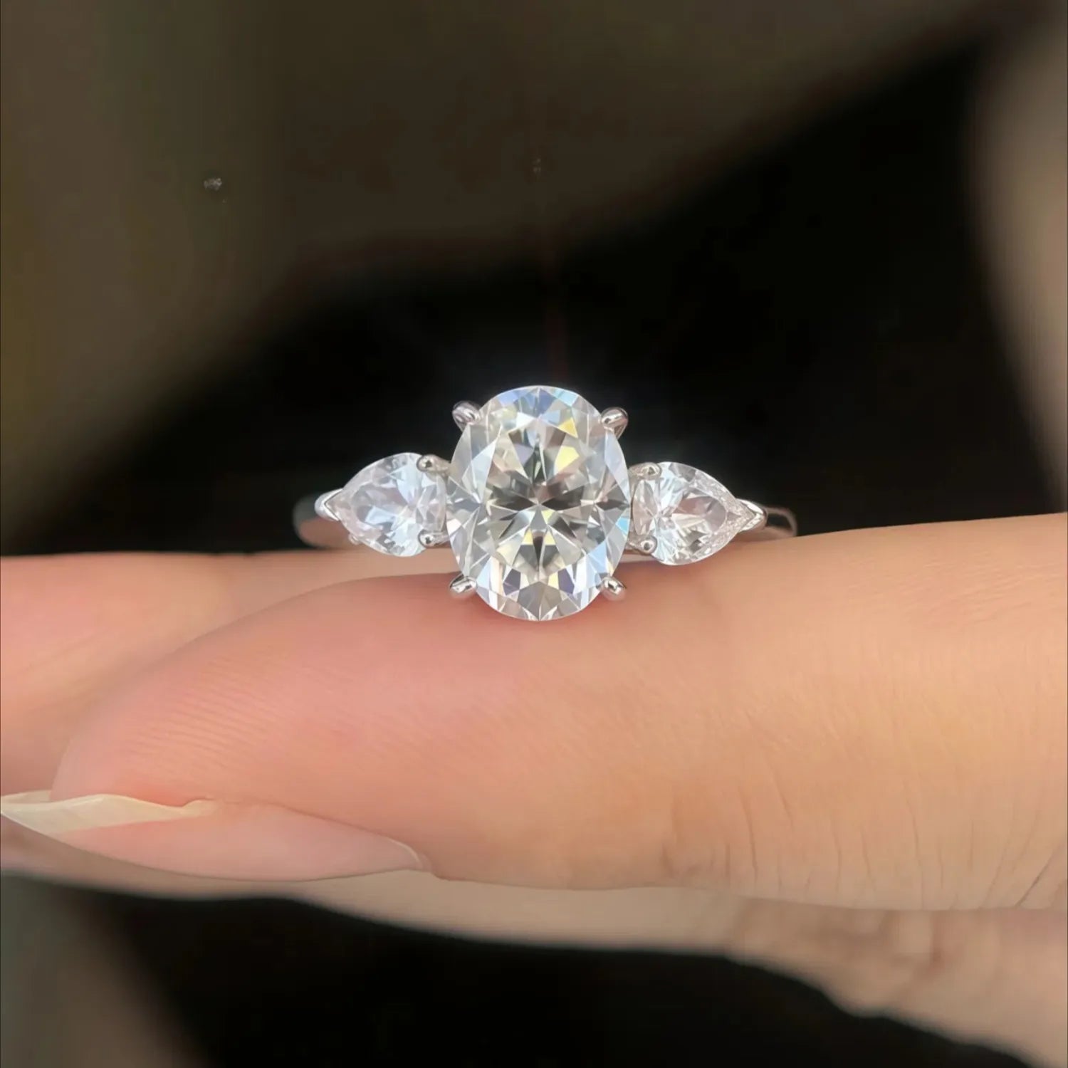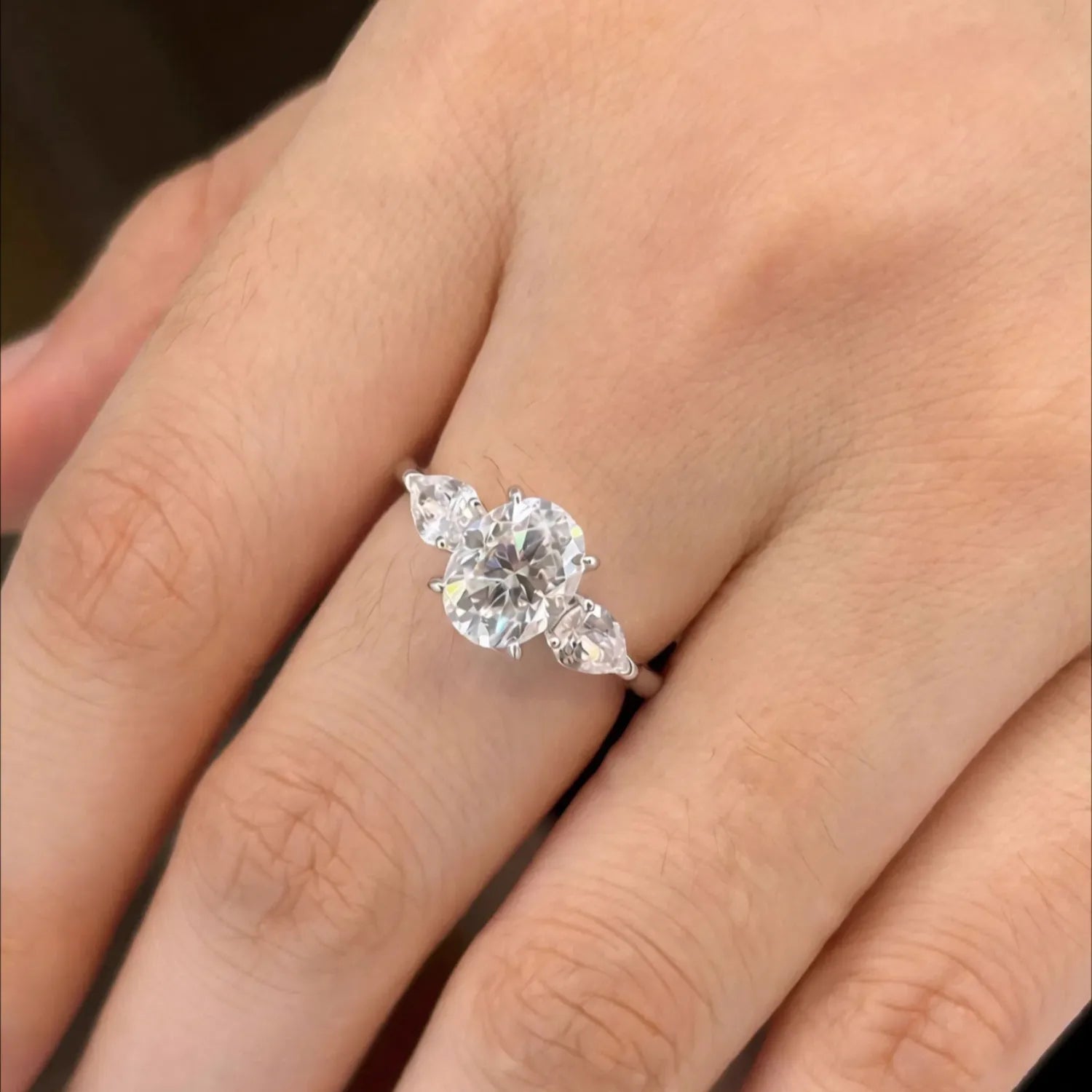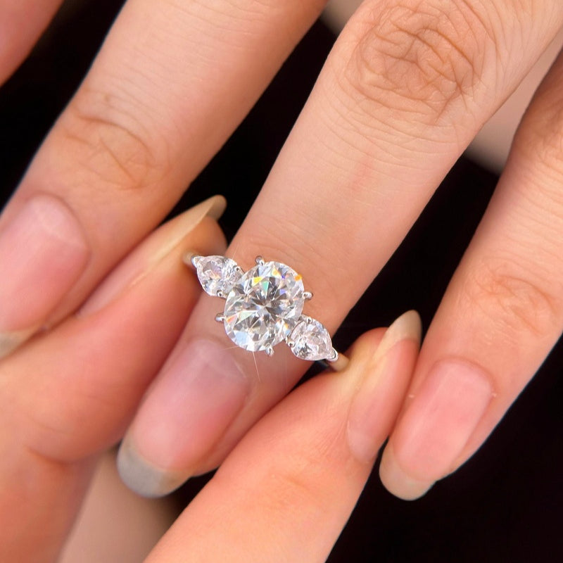 Timeless elegance with captivating brilliance. This stunning ring features a magnificent Oval-cut center stone, renowned for its flattering, elongated shape and spectacular fire. It is perfectly complemented by two brilliant Pear-cut side stones, symbolizing the past, present, and future of your love. The smooth, refined band is crafted from durable Genuine Sterling Silver (S925), offering a bright, comfortable, and enduring setting for this classic design. A truly exquisite choice for an unforgettable moment.