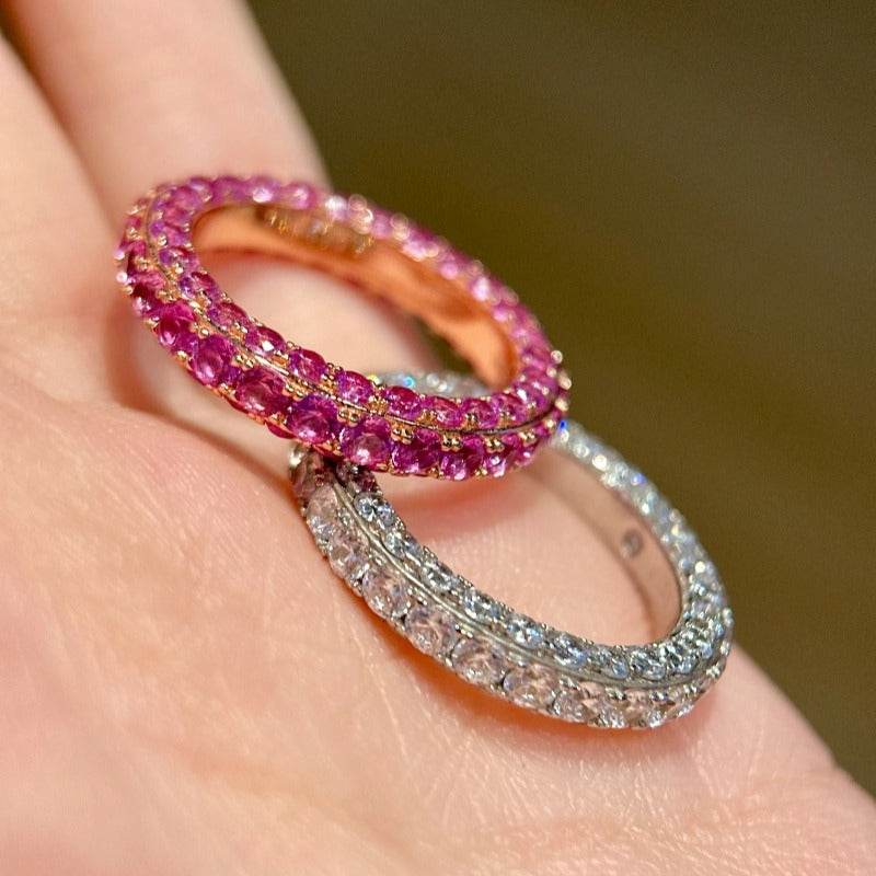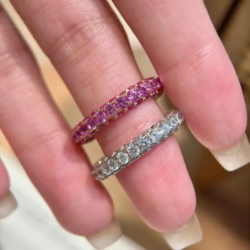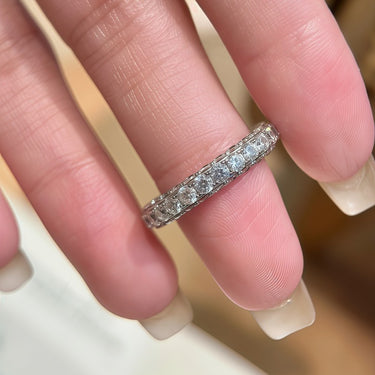 Timeless romance enhanced by intricate detail. This exquisite full-eternity band is richly set with a continuous circle of brilliant Round-cut white gemstones, symbolizing endless love. The sides of the band feature delicate cut-out/filigree work and fine milgrain detailing, lending a captivating vintage, Art Deco-inspired elegance.